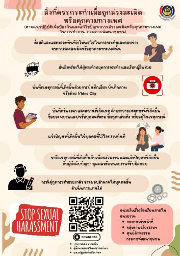 กรมการพัฒนาชุมชนได้ดำเนินการทบทวนแนวปฏิบัติเพื่อป้องกันและแก้ไขปัญหาการล่วงละเมิดหรือคุกคามทางเพศในการทำงาน ของกรมการพัฒนาชุมชน เพื่อประชาสัมพันธ์ให้บุคลากรในสังกัดทราบและถือปฏิบัติ รายละเอียดตามหนังสือกรมการพัฒนาชุุมชน ที่ มท 0402.2/ว 4853 ลงวันที่ 21 พฤศจิกายน 2568 และหนังสือกองการเจ้าหน้าที่ กรมการพัฒนาชุมชน ที่ มท 0402.2/ว 574 ลงวันที่ 21 พฤศจิกายน 2568