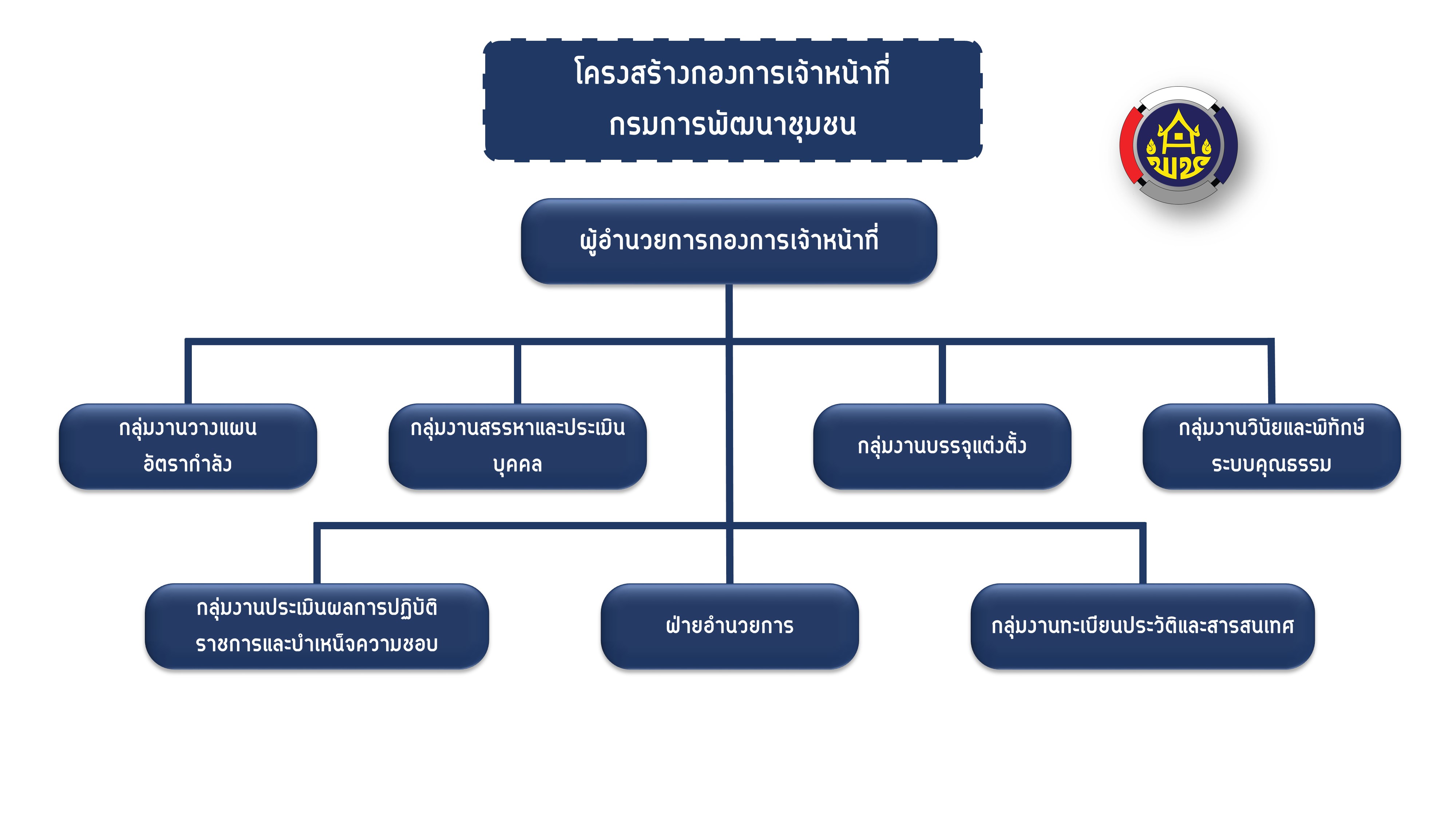 ตามที่ กฎกระทรวงแบ่งส่วนราชการกรมการพัฒนาชุมชน กระทรวงมหาดไทย พ.ศ.2552 ได้มีผลบังคับใช้ตั้งแต่วันที่ 8 เมษายน พ.ศ.2552 และคำสั่งกรมการพัฒนาชุมชน ที่่ 842/2562 ลงวันที่ 16 กันยายน พ.ศ. 2562 โดยแบ่งส่วนโครงสร้างกองการเจ้าหน้าที่ ออกเป็น 6 กลุ่มงาน และ 1 ฝ่าย ดังต่อไปนี้